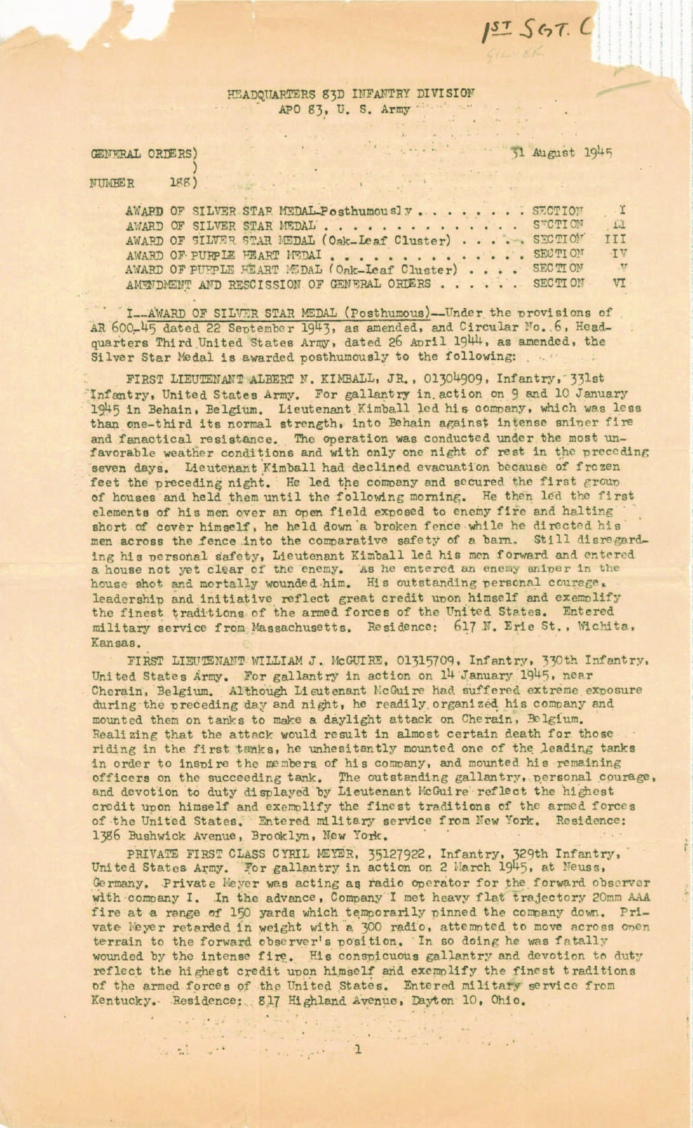 | First Lieutenant Albert Kimball was a member of A Company. The morning report for July 10, 1944 on page 14 lists him lightly wounded in action and transferred to the 96th Evacuation Hospital. The morning report for August 12, 1944 on page 19 lists him returning to the unit on July 10, 1944. First Lieutenant Albert Kimball was awarded a Silver Star posthumously. The commendation is listed in General Order 188 and can be seen below: FIRST LIEUTENANT ALBERT N. KIMBALL, JR., O1304909, 331st Infantry, United States Army. For gallantry in action on 9 and 10 January 1945 in Behain, Belgium. Lieutenant Kimball led his company, which was less than one-third its normal strength, into Behain against intense sniper fire and fanactitcal resistance. The operation was conducted under the most unfavorable weather conditions and with only one night of rest in the preceding seven days. Lieutenant Kimball had declined evacuation because of frozen feet the preceding night. He led the company and secured the first group of houses and held them until the following morning. He then led the first elements of his men over an open field exposed to enemy fire and halting short of cover himself, he held down a broken fence while he directed his men across the fence into the comparative safety of a barn. Still disregarding his personal safety, Lieutenant Kimball led his men forward and entered a house not yet clear of the enemy. As he entered an enemy sniper in the house shot and mortally wounded him. His outstanding personal courage, leadership and initiative reflect great credit upon himself and exemplify the finest traditions of the armed forces of the United States. Entered military service from Massachusetts. Residence 617 N. Erie St., Wichita, Kansas. The author of this website notes that Behain should be Bihain, Belgium and that 331st should be 330th. Chip Henneman provided me with the commendation letter to his wife Mrs. Madeen Kimball which can be seen below. |