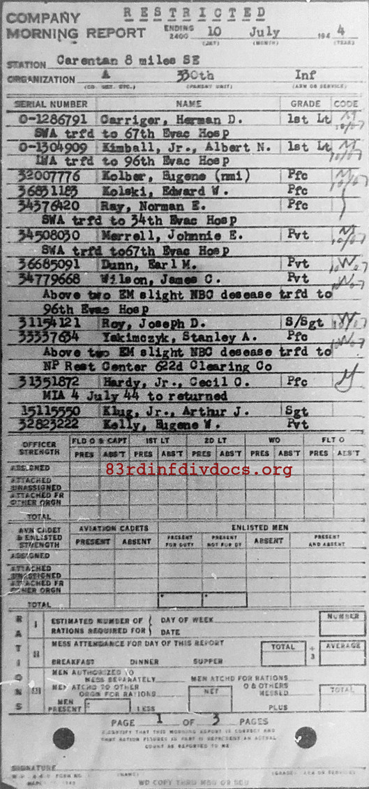| 1944-07-10 | 1LT | Lightly wounded in action and transferred to 96th Evacuation Hospital on July 10, 1944 | A / 330 | view page | |