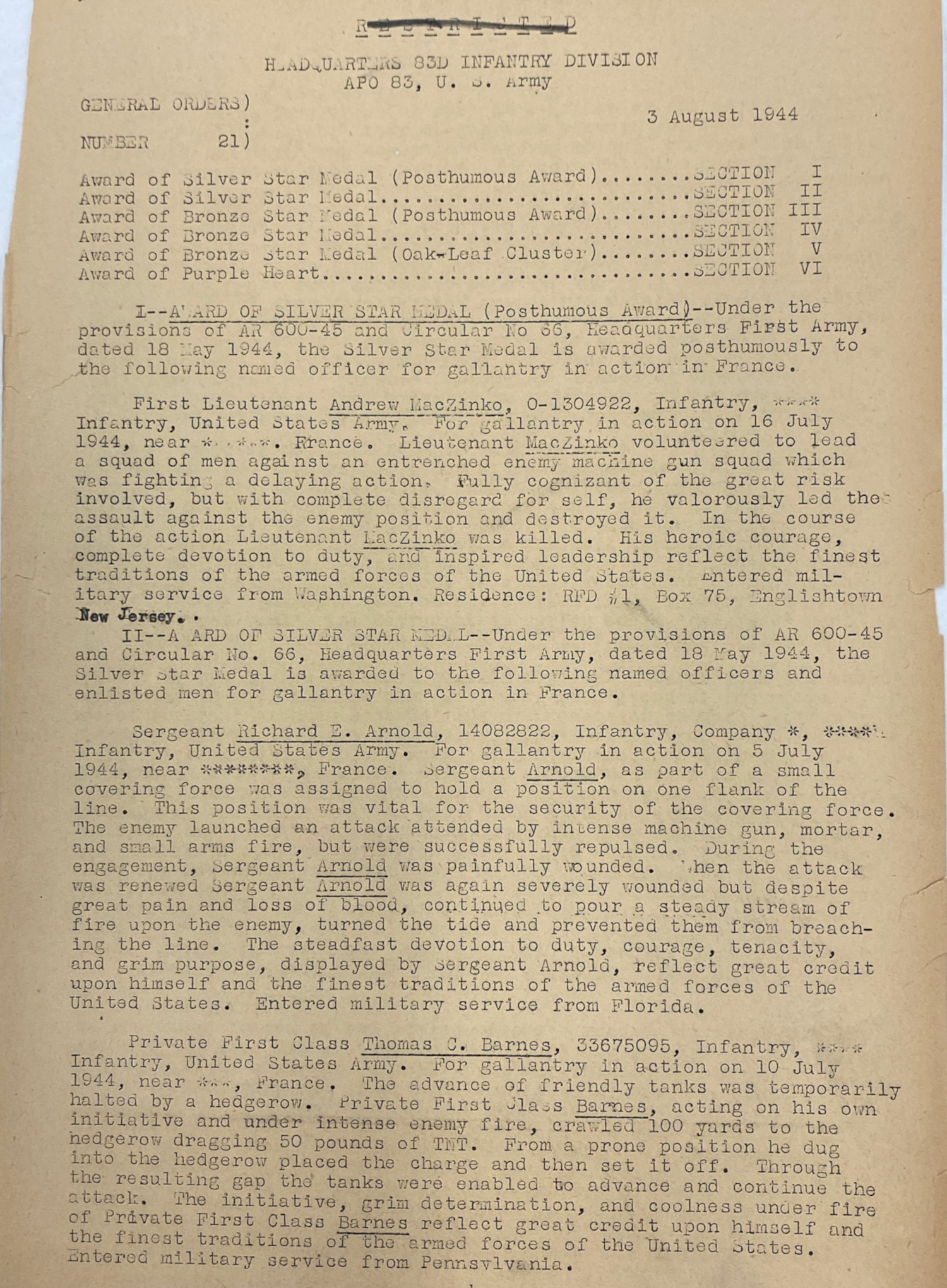 For gallantry in action on 16 July 1944, near *****, France. Lieutenant MacZinko volunteered to lead a squad of men against an entrenched enemy machine gun squad which was fighting a delayed action. Fully cognizant of the great risk involved, but with complete disregard for self, he valorously led the assault against the enemy position and destroyed it. In the course of the action Lieutenant MacZinko was killed. His heroic courage, complete devotion to duty, and inspired leadership reflect the finest traditions of the armed forces of the United States. Entered military service from Washington. |