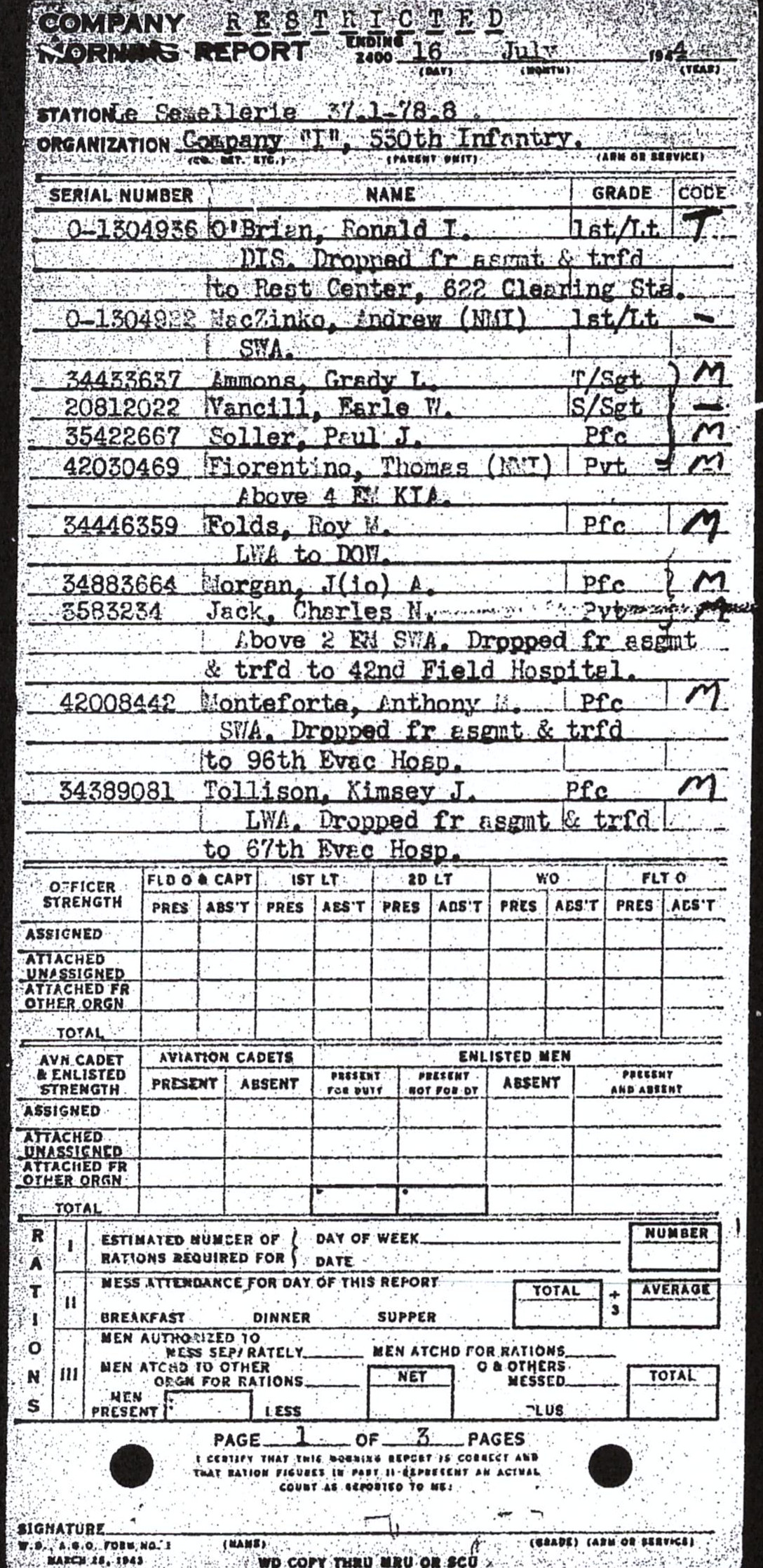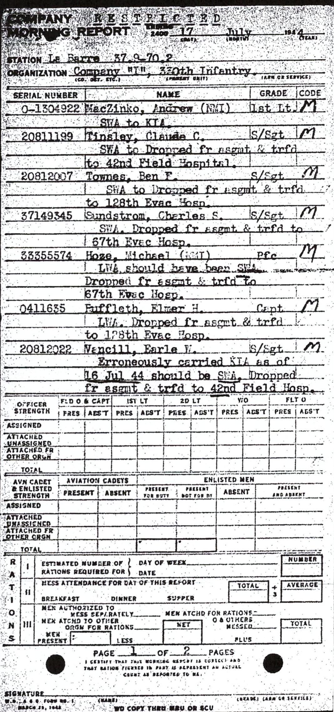 | First Lieutenant MacZinko was a member of I Company. The morning report for July 17, 1944 on page 28 lists him as severely wounded in action. Page 28, for July 17, 1944, changes his status to killed in action. The pages can be seen below. |