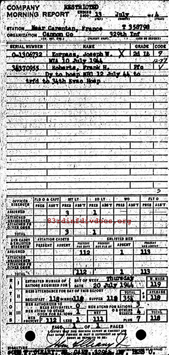 | 2nd Lieutenant Korpacz was a member of the Cannon Company. The morning report for July 13, 1944 on page 13 shows him going MIA on July 10, 1944 and KIA on July 14, 1944 on page 14. Page 13 and 14 can be seen here as well. |