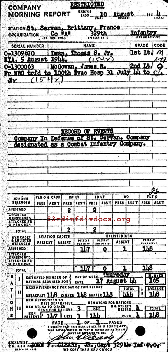 | First Lieutenant Dwan was a member of A Company. The morning report for July 21, 1944 on page 57 shows him joining A Company from the 48th Replacement Battalion. Page 13 in the morning report of August 10, 1944 lists him as killed in action on August 5, 1944. Both pages can be seen below. |