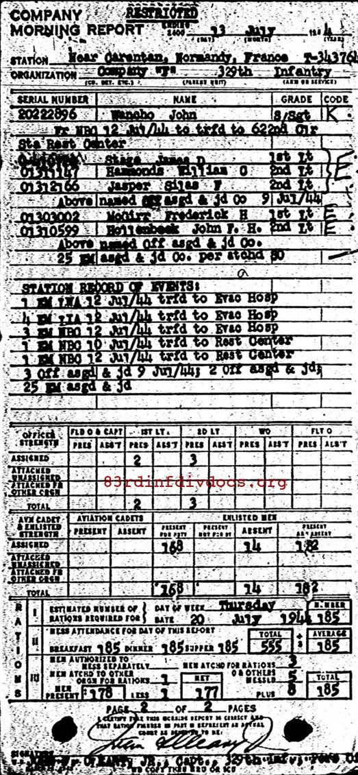 | 2nd Lieutenant Hammonds was a member of F Company. The morning report for July 13, 1944 on page 34 lists him joining F Company together with several other officers on July 9, 1944. The morning report for August 13, 1944 on page 21 lists him as killed in action on August 5, 1944 together with two other officers but he is listed as a First Lieutenant. This error is corrected on page 31. All pages can be seen below. |