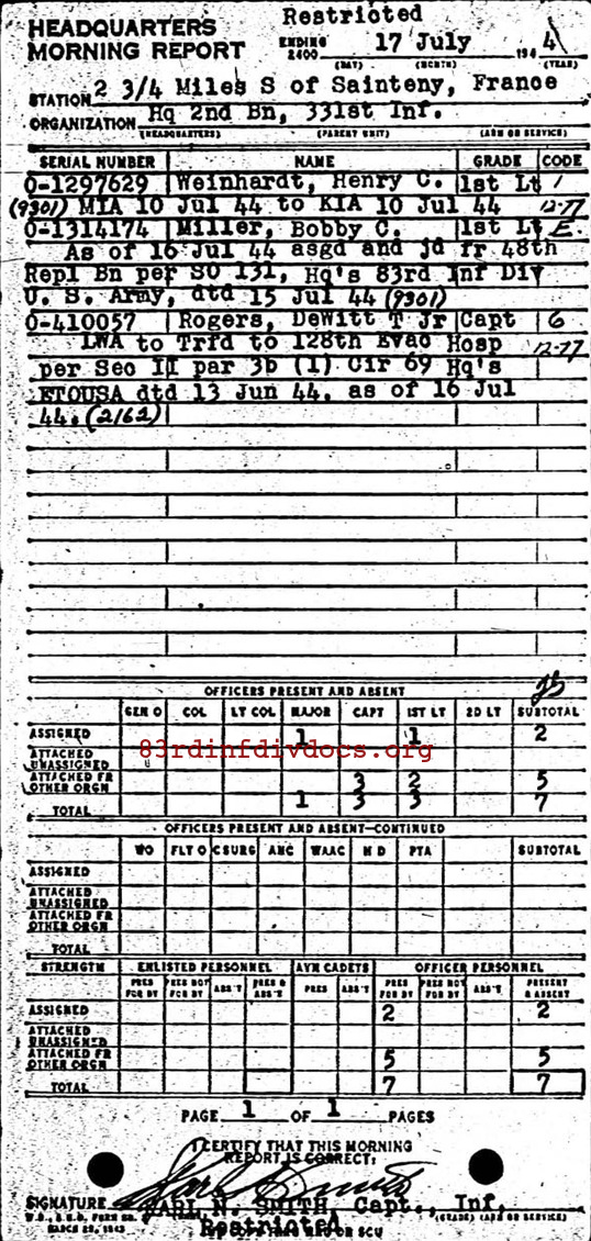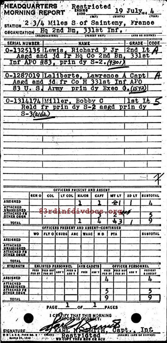 | 1944-07-19 | 1LT | Duty changed to Operations and Training Officer (S3) (2162) as of July 19, 1944 | 9301 | HQ2BN / 331 | view page |