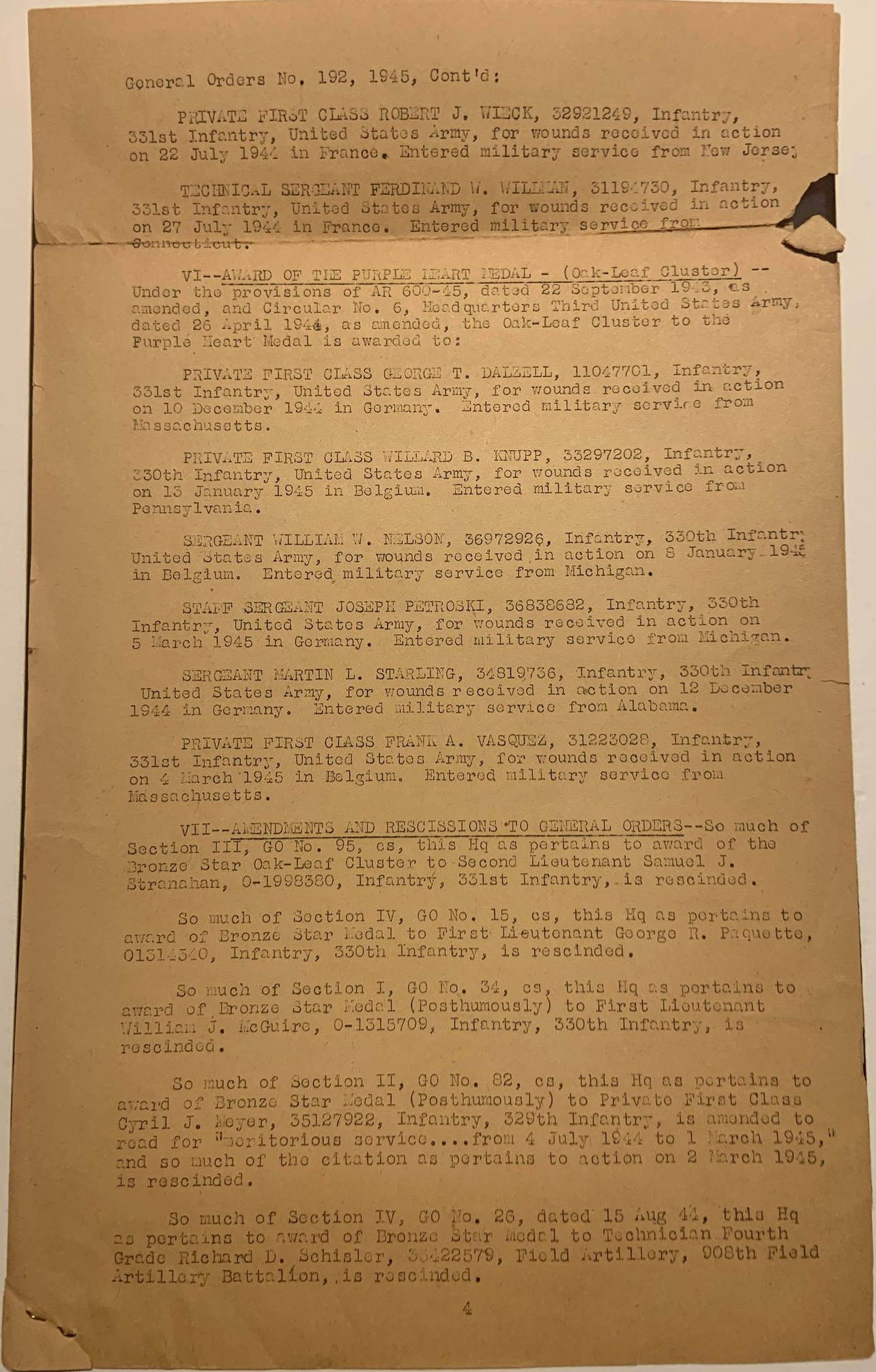 below. First Lieutenant William J. McGuire was awarded a Silver Star posthumously. The commendation is listed in General Order 188 which can be seen below: FIRST LIEUTENANT WILLIAM J. McGUIRE, O1315709, 330th Infantry, United States Army. For gallantry in action on 14 January 1945 near Cherain, Belgium. Although Lieutenant McGuire had suffered extreme exposure during the preceding day and night, he readily organized his company and mounted them on tanks to make a daylight attack on Cherain, Belgium. Realizing that the attack would result in almost certain death for those riding in the first tanks, he unhesitantly mounted one of the leading tanks in order to inspire the members of his company, and mounted his remaing officers on the succeeding tank. The outstanding gallantry, personal courage and devotion to duty displayed by Lieutenant McGuire reflect the highest credit upon himself and exemplify the finest traditions of the armed forces of the United States. Entered military service from New York. Residence 1386 Bushwick Avenue, Brooklyn New York. |