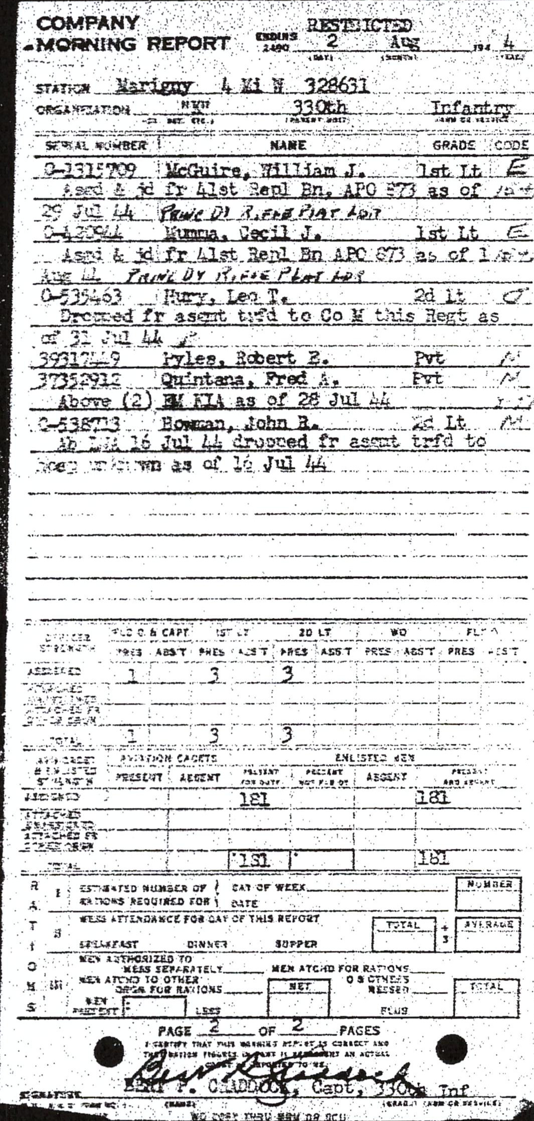 | First Lieutenant McGuire was a member of K Company. The morning report for August 2, 1944 on page 6 lists him joining the unit from the 41st Replacement Battalion on July 29, 1944. The morning report for October 27, 1944 on page 28 lists him slightly sick. The morning report for December 16, 1944 on page 24 lists him lightly wounded in action but remaining on duty. The pages can be seen