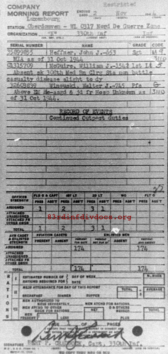 | 1944-11-02 | 1LT | Returned to duty from Clearing Station, 308th Medical Battalion on November 2, 1944 | 1542 | K / 330 | view page |