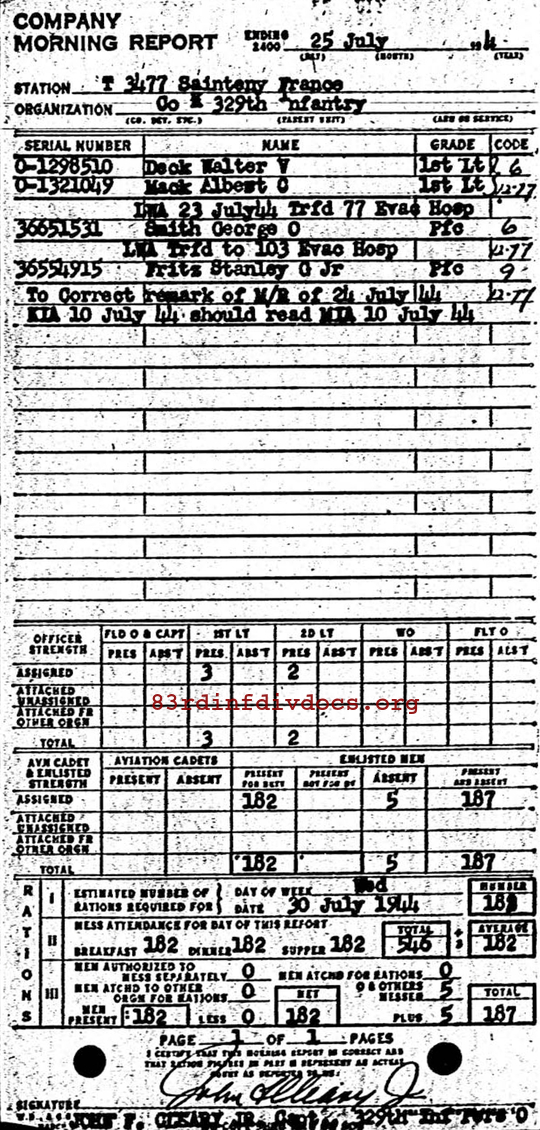 | 1944-07-25 | 1LT | Lightly wounded in action and transferred to 77th Evacuation Hospital on July 23, 1944 | K / 329 | view page | |
