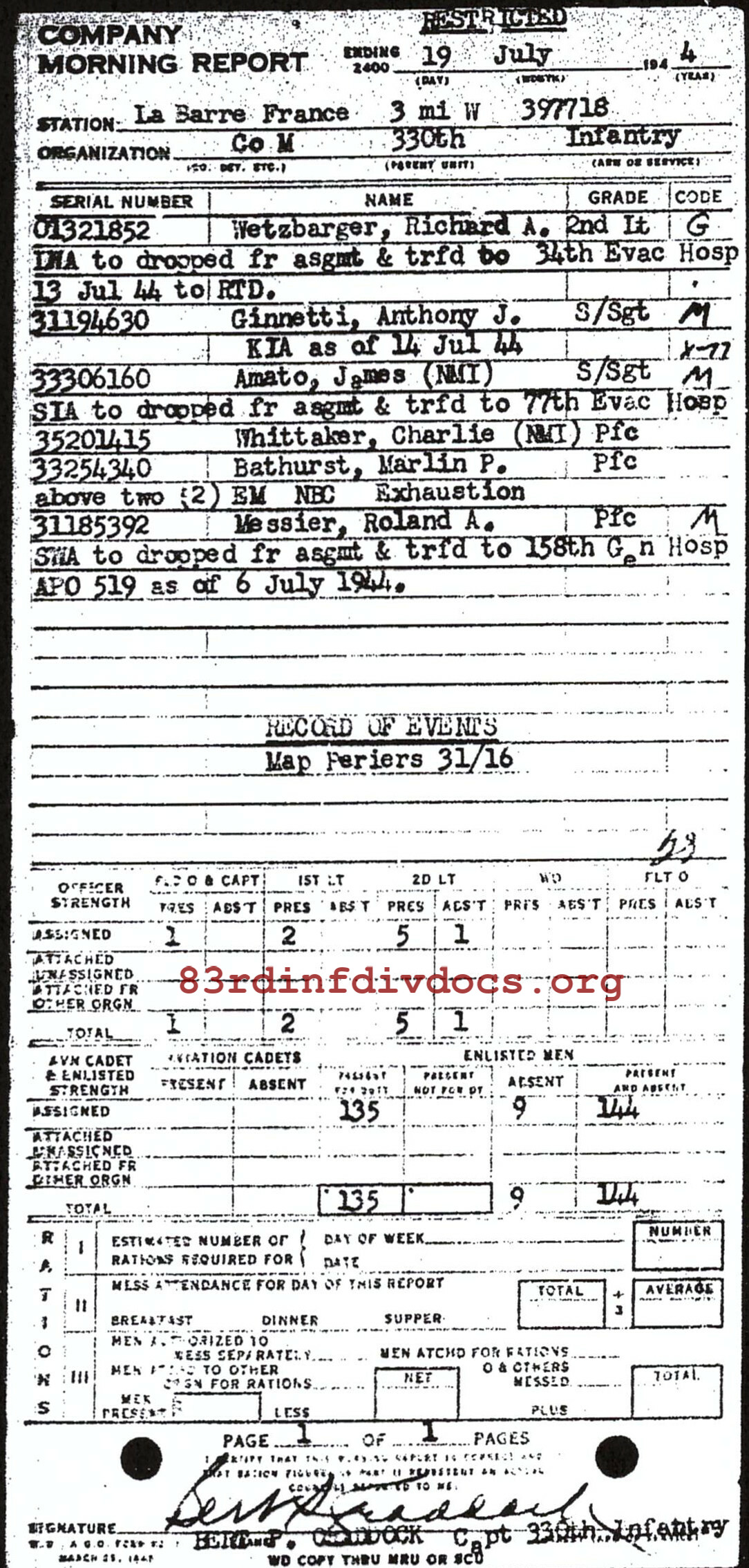 | 1944-07-13 | 2LT | Lightly wounded in action and transferred to 34th Evacuation Hospital on July 13, 1944 | M / 330 | view page | |