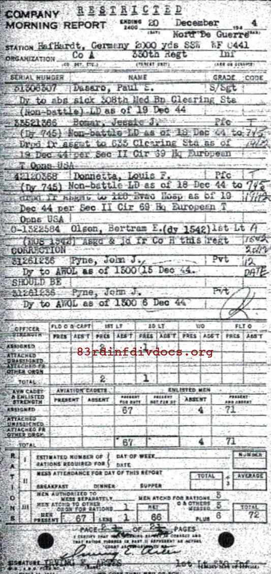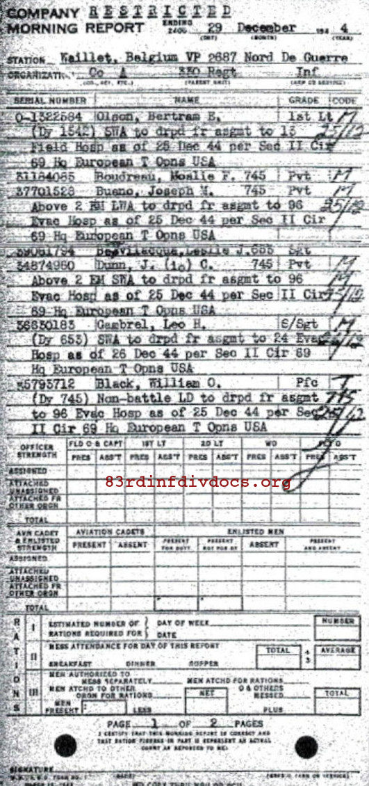 | First Lieutenant Olson joined the 330th as a member of H Company. The morning report for July 17, 1944 on page 23 lists him joining H Company from the 41st Replacement Battalion and he was assigned to the Mortar Section as a 2LT. The morning report for December 10, 1944 on page 10 lists him a 1LT and lightly injured in action on December 5, 1944 but he remained on duty. Page 20, for December 20, 1944, shows him assigned to A Company 330th. The morning report for A Company confirms this. The A Company morning report for December 29, 1944 on page 42 lists him as severly wounded and transferred to a Field Hospital on December 25, 1944. The pages can be seen below. |