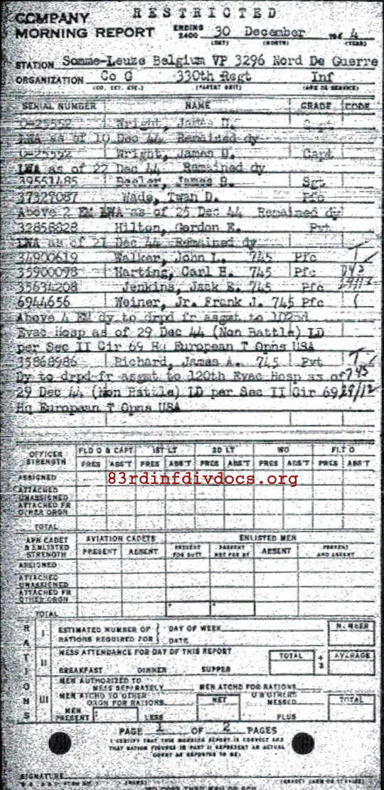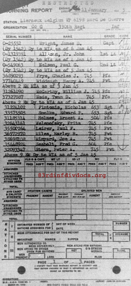 | Captain Wright was a member of G Company. The morning report for August 26, 1944 on page 42 lists his promotion to Captain on August 21, 1944. The morning report for December 30, 1944 on page 49 lists him lightly wounded in action on December 2