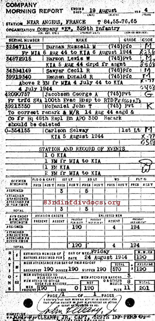 | From the Thunderbolt Summer issue 2006, an article written by the stepson of 1st Lt. Selway C. Carlson: According to Buckshot history, on August 4, Company E marched to a defilade position near Dolet (Doslet) in a wide ditch that flanked the railroad track. They jumped off at dusk on August 4 in the face of an intense concentration of enemy fire, including the huge 340 millimeter coastal guns at St. Malo. During the early morning of August 5, 1944, it was this coastal barrage that killed my step-father.. First Lieutenant Carlson was a member of E Company. The morning report for July 26, 1944 on page 92 shows him joining E Company from HQ 329th Infantry Regiment. Page 92 can be seen here. The morning report for August 19, 1944 on page 39 shows him killed in action on August 5, 1944. Page 38 can be seen here. |