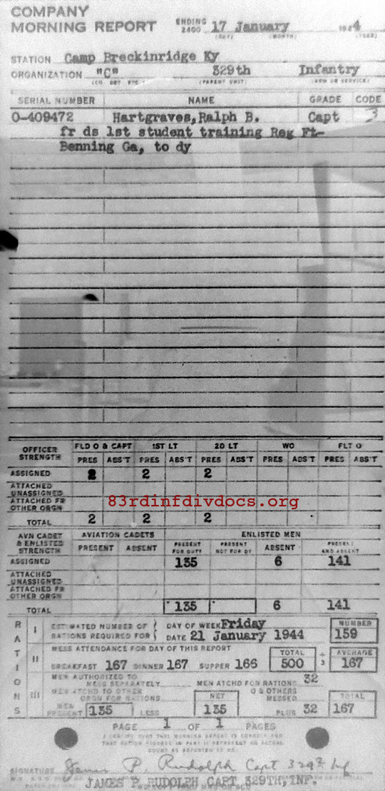 | 1944-01-17 | CAPT | Returned to duty from First student training Reg Fort Benning, Georgia on January 17, 1944 | C / 329 | view page | |