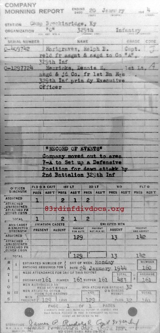 | 1944-01-20 | CAPT | Transferred to A Company, 329th Infantry Regiment as of January 20, 1944 | C / 329 | view page | |
