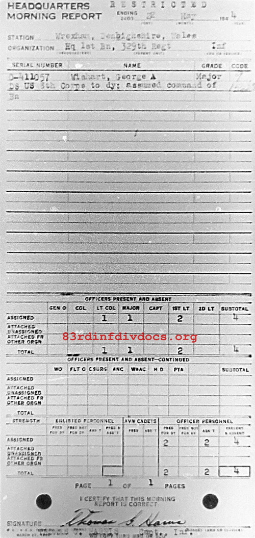 | 1944-05-22 | CAPT | Relieved of command as of May 22, 1944 | HQ1BN / 329 | view page | |