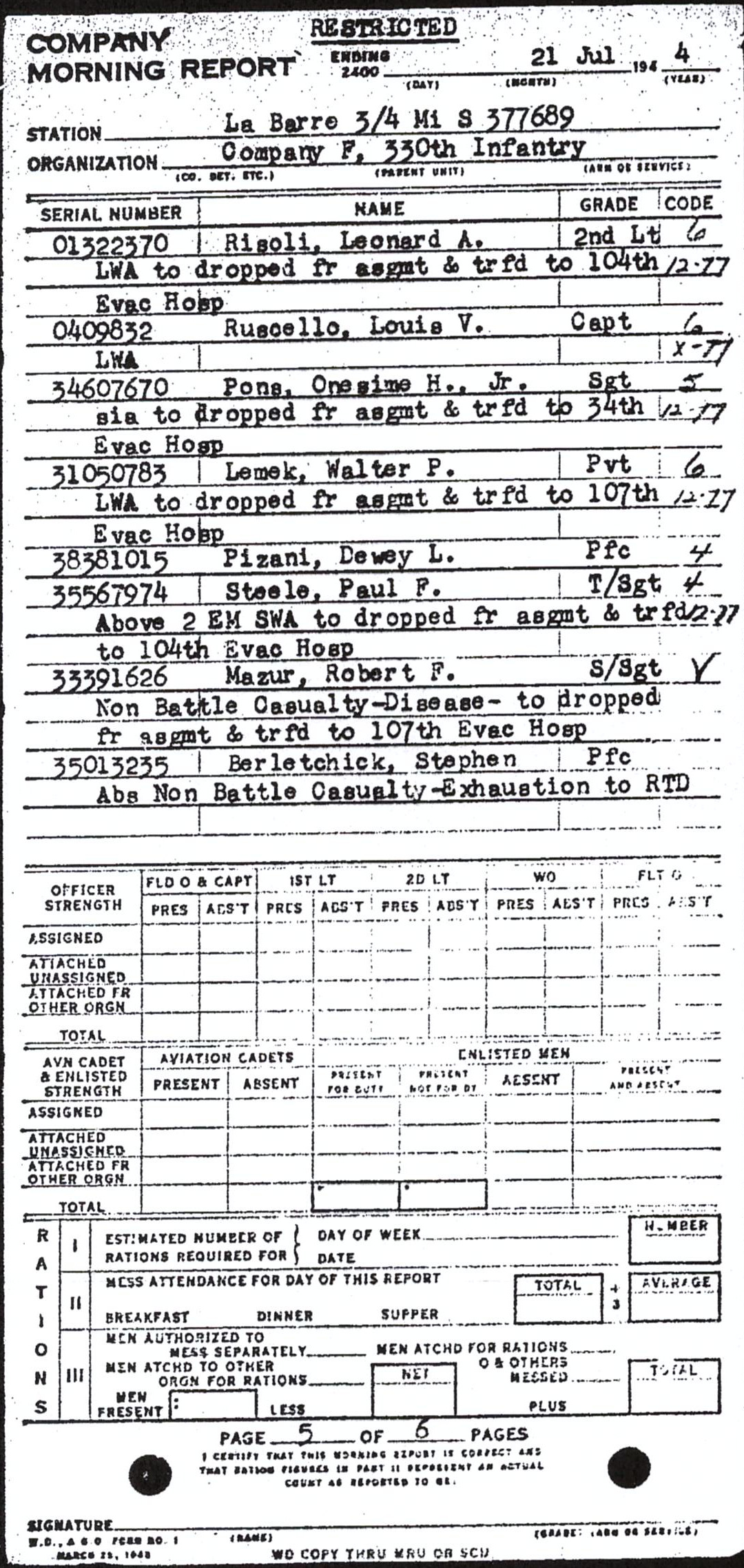 Captain Ruscello's full name is Louis Vincent Ruscello and he was the commanding officer of F Company. The morning report for July 11, 1944 on page 27 lists him as returning to duty on July 11, 1944. The same morning report on page 53 lists him as Lightly Wouned in Action. The morning report for August 1, 1944 on page 1 lists him returning to his unit. Page 20, for August 11, 1944, lists him as Severely Wounded in Action and page 21 for August 12, 1944, lists him as Died of Wounds on August 7, 1944. The relevant pages can be seen below.