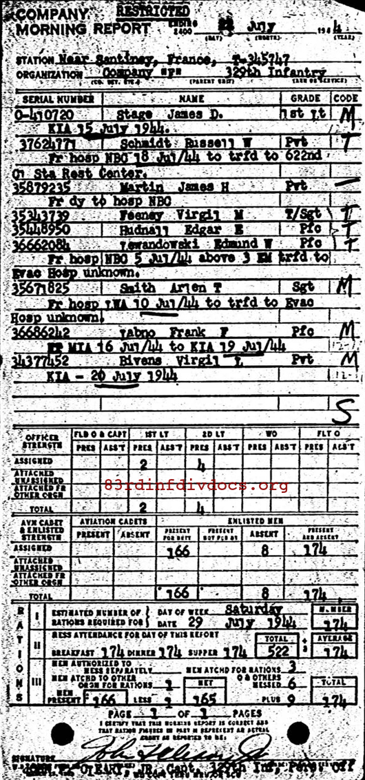 | First Lieutenant Stage was a member of F Company. The morning report for July 13, 1944 on page 34 lists him joining F Company together with several other officers on July 9, 1944. Page 63, for July 22, 1944 lists him as killed in action on July 15, 1944. All pages can be seen below. We note that this date does not match the date of ABMC which is July 11, 1944 so there might be a later morning report correcting this last date. |