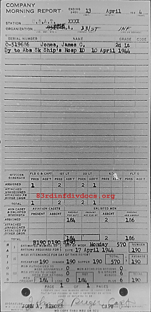 The morning report confirms this. Second Lieutenant Jones was a member of A Company. The morning report for July 12, 1944 on page 18 lists him killed in action on July 5, 1944. The page can be seen below. |