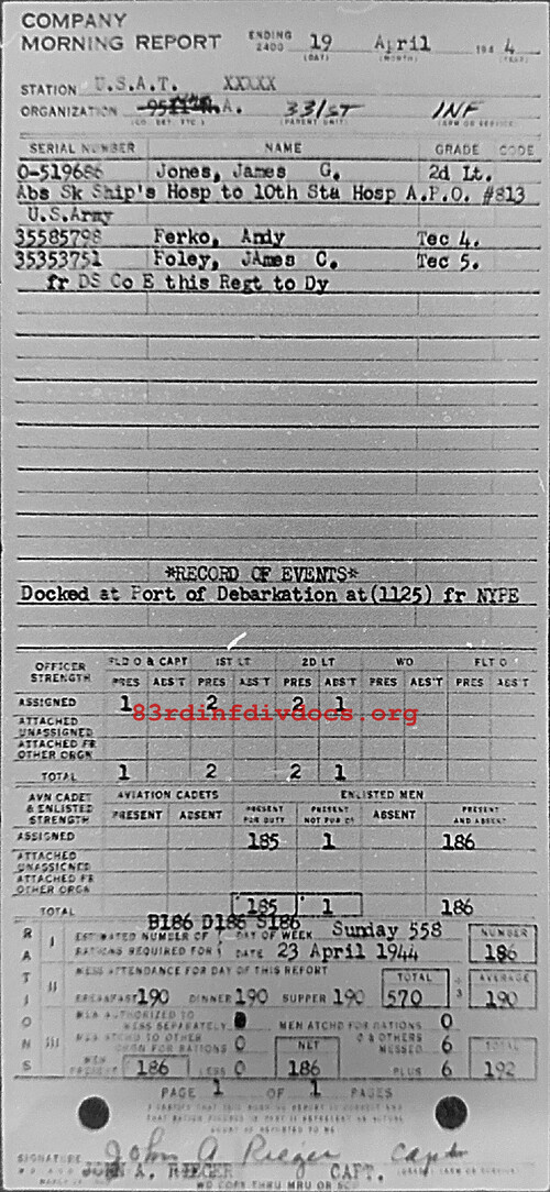 | 1944-04-13 | 2LT | Non battle casualty and duty to Ship's Hospital on April 10, 1944 | A / 331 | view page | |