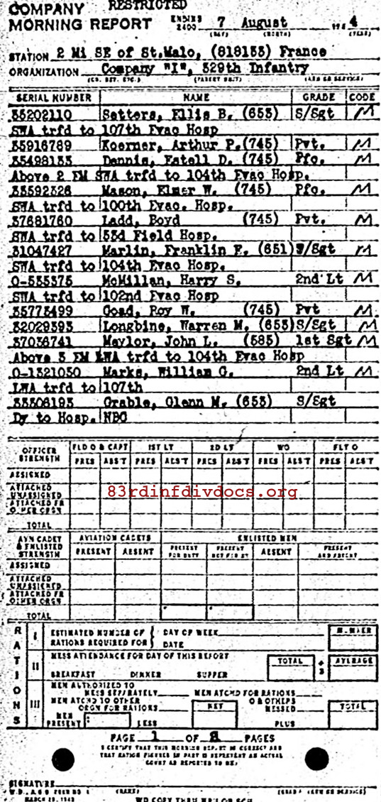 | 1944-08-07 | 2LT | Severely wounded in action and transferred to 102nd Evacuation Hospital on August 7, 1944 | I / 329 | view page | |
