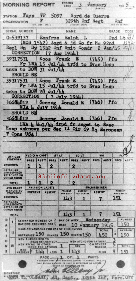 | 1945-01-03 | 2LT | Assigned and joined from 92nd Replacement Battalion as of January 2, 1945 | 1542 | F / 329 | view page |